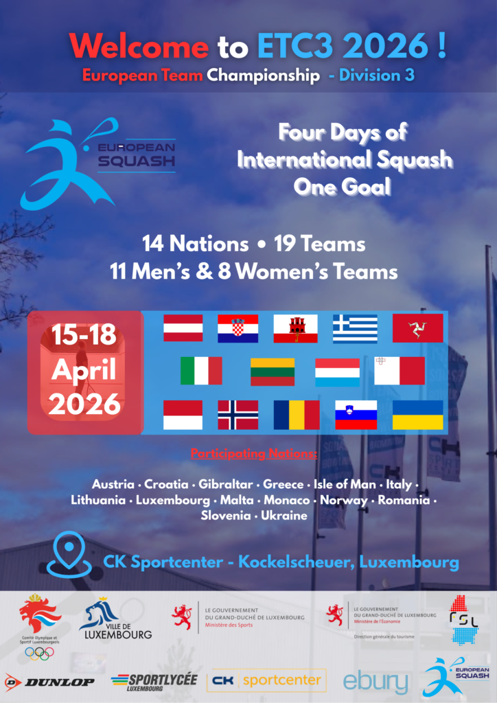 The European Team Championships Division 3 will take place in Luxembourg from 15 to 18 April 2026, bringing together national teams from across Europe for four days of official competition under the authority of the European Squash Federation (ESF).